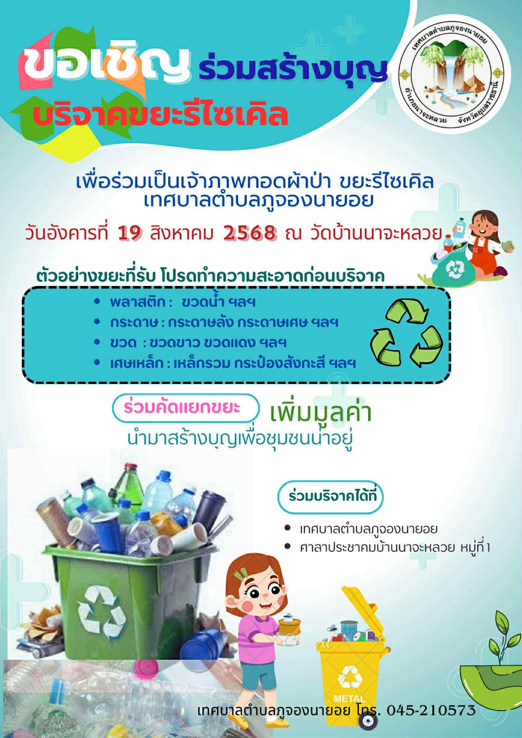 ขอเชิญร่วมบริจาคขยะรีไซเคิล เพื่อสมทบทุนทอดผ้าป่าขยะรีไซเคิล ของเทศบาลตำบลภูจองนายอย วันอังคาร ที่ 19 สิงหาคม 2568